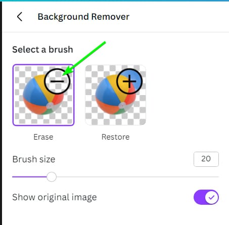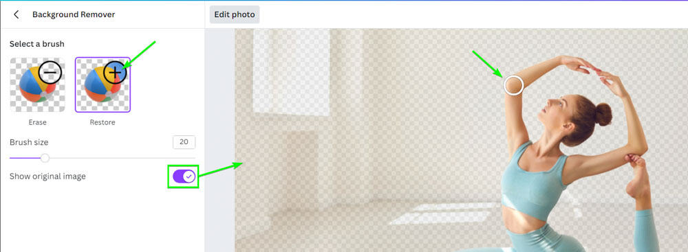 Click on Show Original Image to show a low-opacity version of the original image, making it easier for you to restore the parts of the photo that you want. You can also adjust the brush size up or down with the Brush Size Slider