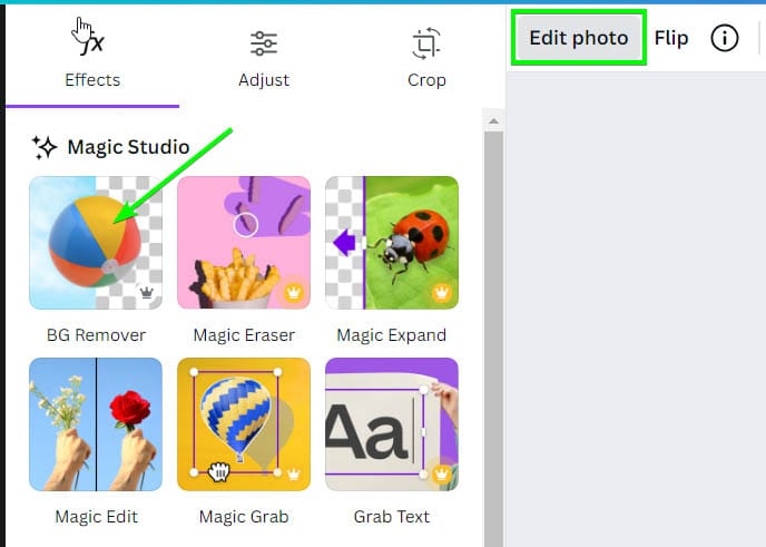 Once your photo or design is ready to go, select it, then click on Edit Photo. To begin making your background transparent, click on BG Remover
