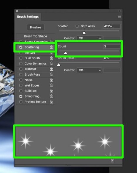 Next, select the Scattering tab, then use the Count slider to add more sparkles to the โtipโ of your brush. Adjust the slider between 3 and 5.