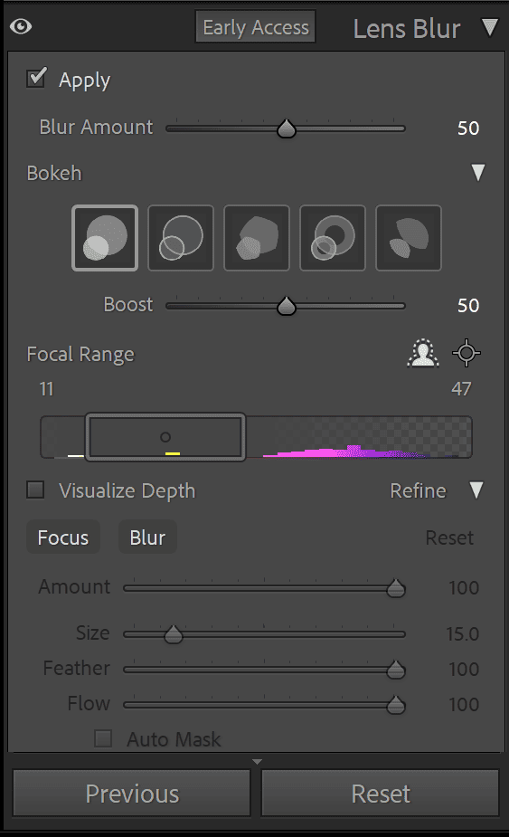 The Bokeh section refers to the type of blur the background experiences (whether circular, 5-blade, or other). The Focal Range adjusts the values of what is in focus, and the Depth controls the amount of focus and the amount of blur.