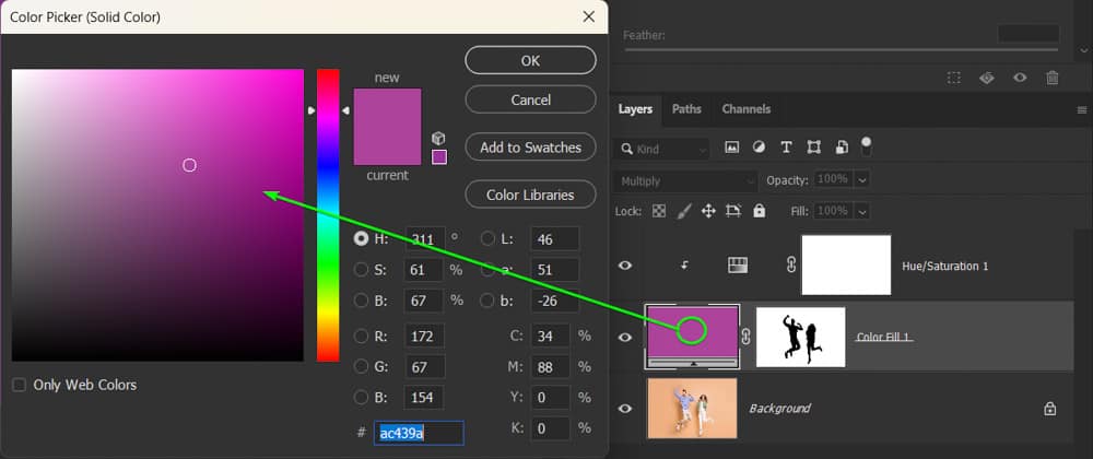You can now add the new color directly to the background by clicking on the New Adjustment Layer icon at the bottom of the Layers Panel and selecting Solid Color. Then, choose a new background color in the Color Picker and click OK.