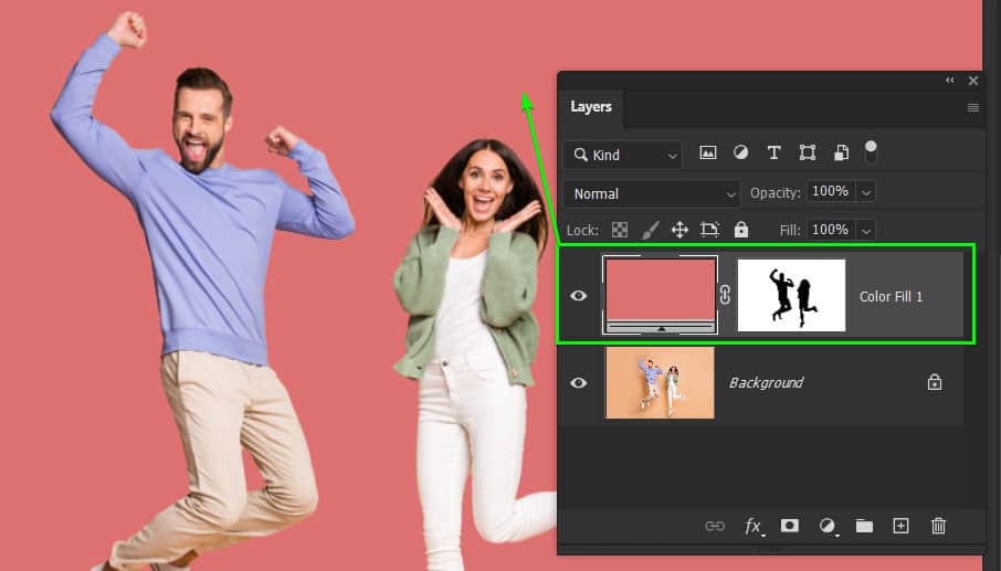 This automatically adds a solid fill layer with a Layer Mask to the image. If you are adding a new background color to a complex background, you can stop here with the new background color. However, if your image is on a solid-colored background and has shadows, continue to refine the background.