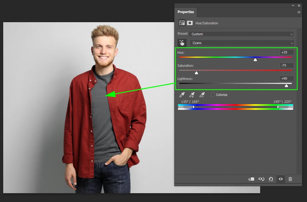 Now, when you adjust the Hue, Saturation, and Lightness slider, the shirt will change color. Remember to only slightly adjust the sliders because changing the color too much will look unnatural.