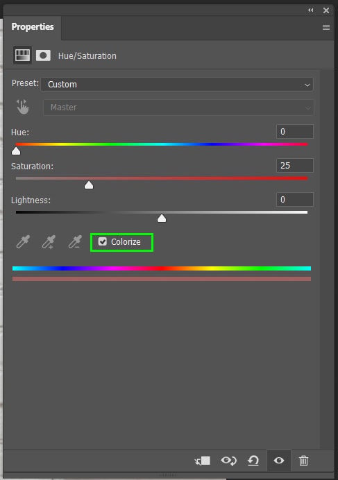 Now enable the Colorize option. The colorize option adds a tinted overlay to the selection, allowing you to add a general hue and saturation to the area.