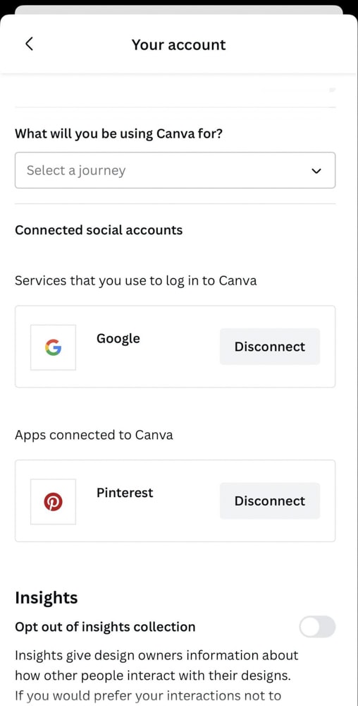 If you open your settings on Canva Mobile to change the language, you will notice something: the language drop-down menu is not there.