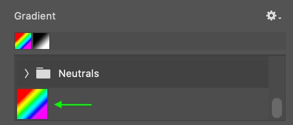 Once youโve made your text, head to Windows > Gradients to open the Gradient Panel in your workstation. Scroll to the bottom and find your custom gradients, including the Rainbow Gradient.