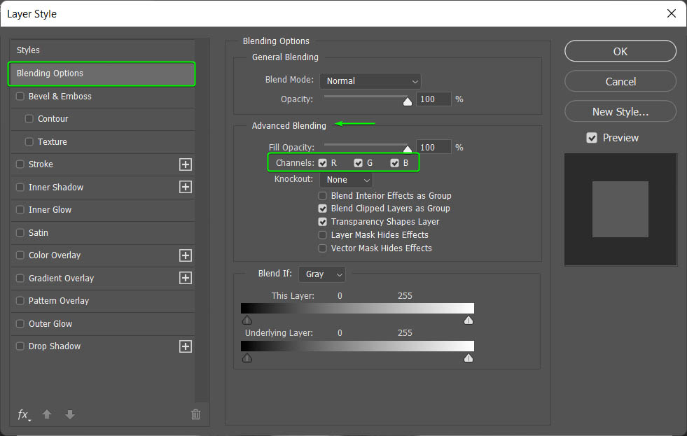 Double-clicking on the layer opens up the Layer Style window in the Blending Options tab. Stay in this tab and find the Channels under Advanced Blending.
