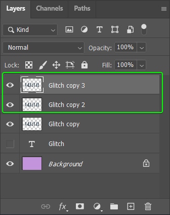 You must create two duplicates of the rasterized text layer to manipulate the RGB channels. Press Control + J (Win) or Command + J (Mac) twice when the rasterized text layer is selected. You now have two extra layers in the Layers panel.
