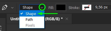 In the Options Bar, click the Mode drop-down arrow and change the mode to Shape.