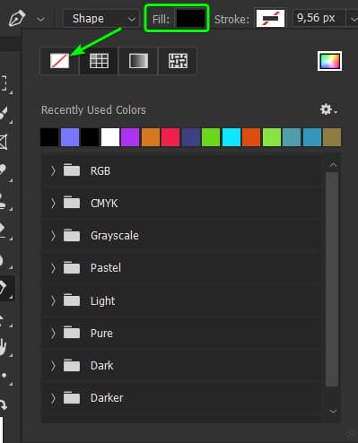 Now, youโll need to set the shape’s Fill to transparent. Click the Fill box in the Options bar. At the top, click the Transparent icon, the first from the left, to ensure the shape fill is transparent.