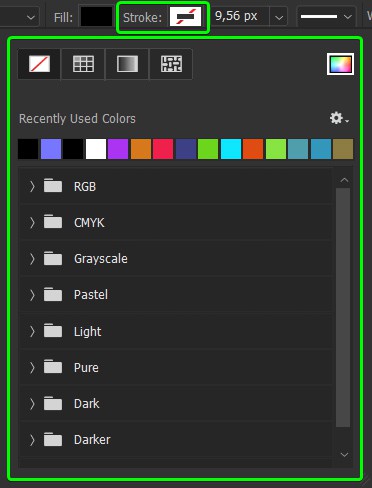 At this point, you can set the appearance of your line by adjusting the stroke settings. In the Options bar, you can change the strokeโs Color by clicking the Stroke Fill Box and choosing from the options.