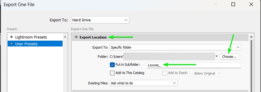 In the Export Location tab, click on Choose and navigate to your desired folder. To create a new subfolder, tick off the Create New Subfolder option and give your folder a name.
