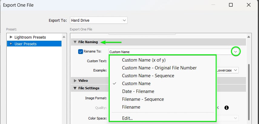 To select the naming method, enable the Rename To option and select your naming option from the menu bar. If applicable, you’ll be able to type in your custom text in the box below. This option will only appear when you select the custom file naming options. Otherwise, you’ll just see an example file name preview, such as “IMG_4570.JPG”.