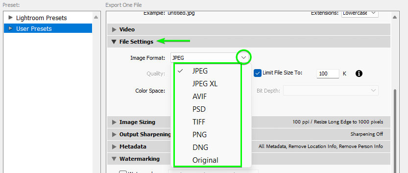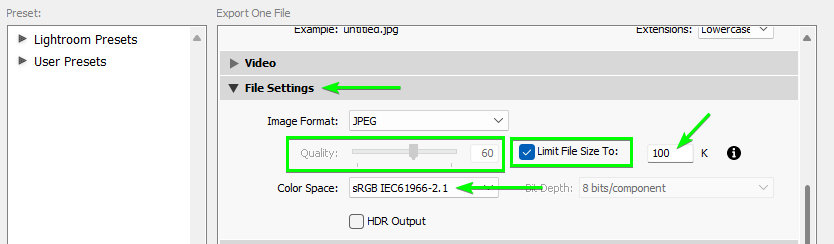 Then, choose the output quality of your photos. If you are exporting proofs for a client, keeping them in low-res files makes it easier to share and upload large numbers of photos. If you need to be specific, you can check off the Limit File Size To option and enter a preset file size. That way, all your photos will export with the maximum file size you entered.