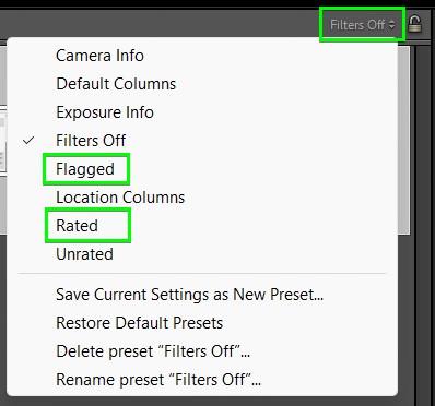 Click on Filters Off at the top right corner of the Library Filter space and change the filter option to Flagged or Rated. Now, only your flagged or rated images will be visible in your library.