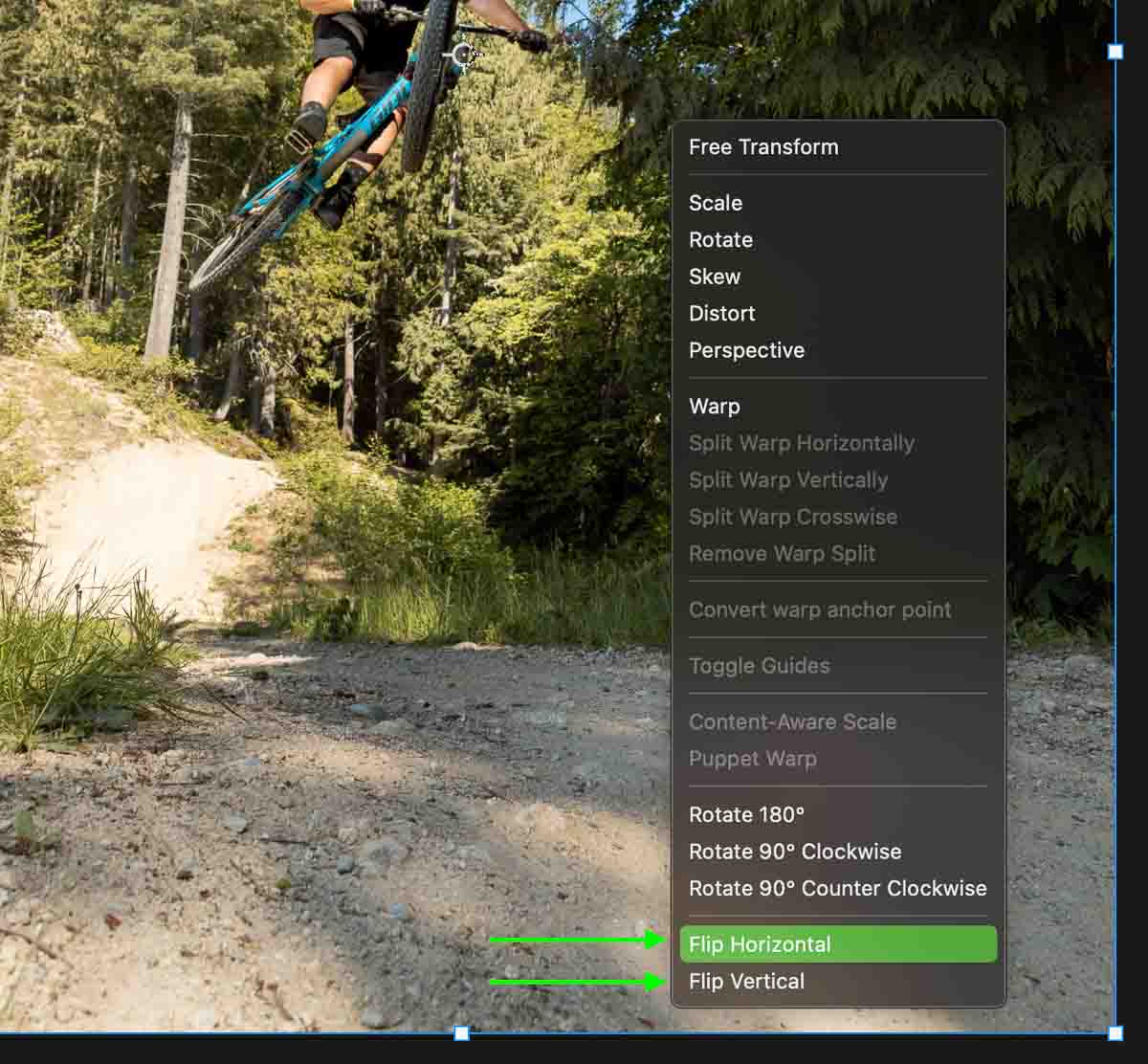 Now press Command + T (Mac) or Control + T (Win) while the selection is active to activate the Transform tool. Then right-click in the selection area and choose Flip Horizontal or Flip Vertical to flip the contents of the selection. Make sure that your image layer is highlighted in the layer panel during this step or it will not work.