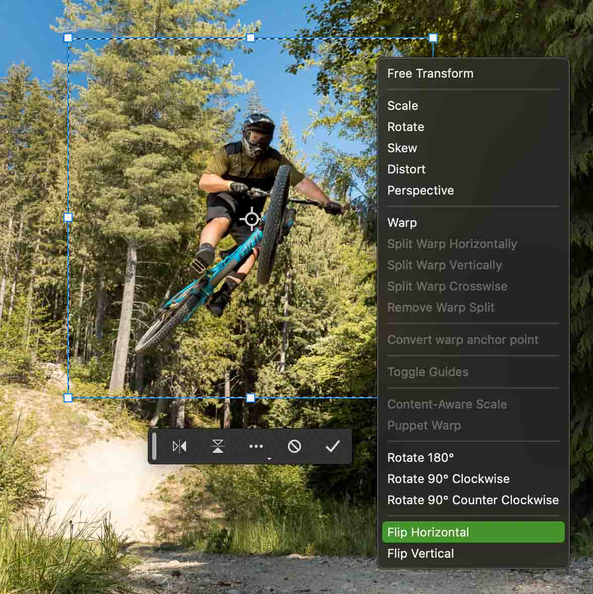 In Photoshop CC, the Contextual Task Bar was introduced to help make flipping images much easier. Although it should be available by default, if you don’t see it, go to Window > Contextual Task Bar to reveal it.