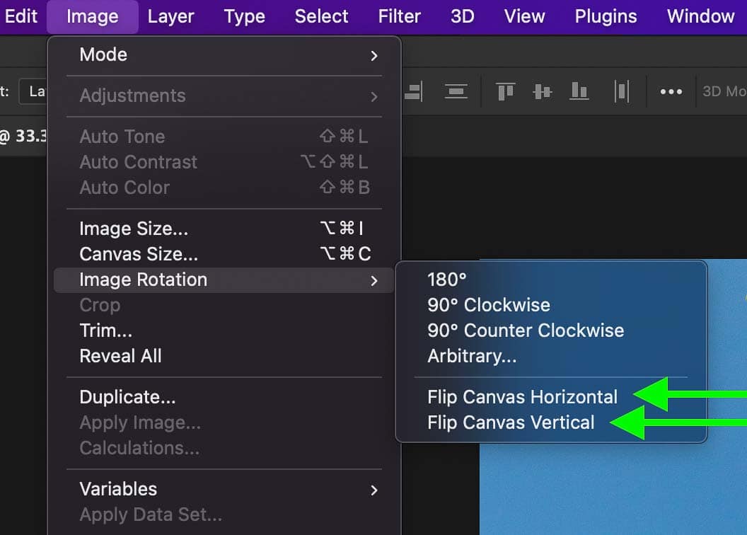 To flip your entire canvas horizontally or vertically in Photoshop, go to Image > Image Rotation and choose the “Flip Canvas Horizontally” or “Flip Canvas Vertically” option. This will flip your canvas and all its contents according to your selected flip adjustment.