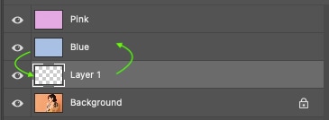 You can also drag layers to reorder them in the Layers panel. To drag, just click the layer you want to move and drag it to the gap you want to move it to.