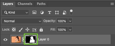 The mask appears as a thumbnail next to the layerโs thumbnail. The white areas show the visible subject, and the black areas are hidden (aka transparent).