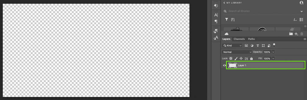 Your new document will open with complete transparency. You will also see the transparent layer in the Layers panel. Since we canโt physically see it, Photoshop will show a gray and white checkered background to represent transparency.