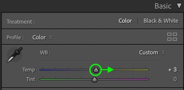 To take things one step further, you can help improve the overall tan by changing the white balance of your photo. Scrolling up to the Basic Panel, move the Temp slider to the right to warm up the image.