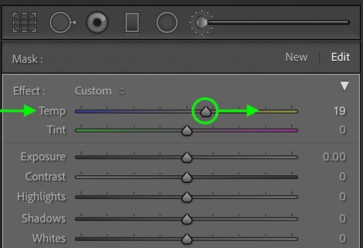 With your selection complete, let’s start tanning. Start by increasing the white balance adjustment to favor a more yellow hue. This is easily done by moving the Temp slider to the right.