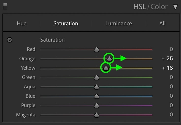 Like with the hue adjustment, you’ll want to focus on the orange and yellow sliders. Increase each of these sliders by moving them to the right until you’re happy with the effects.