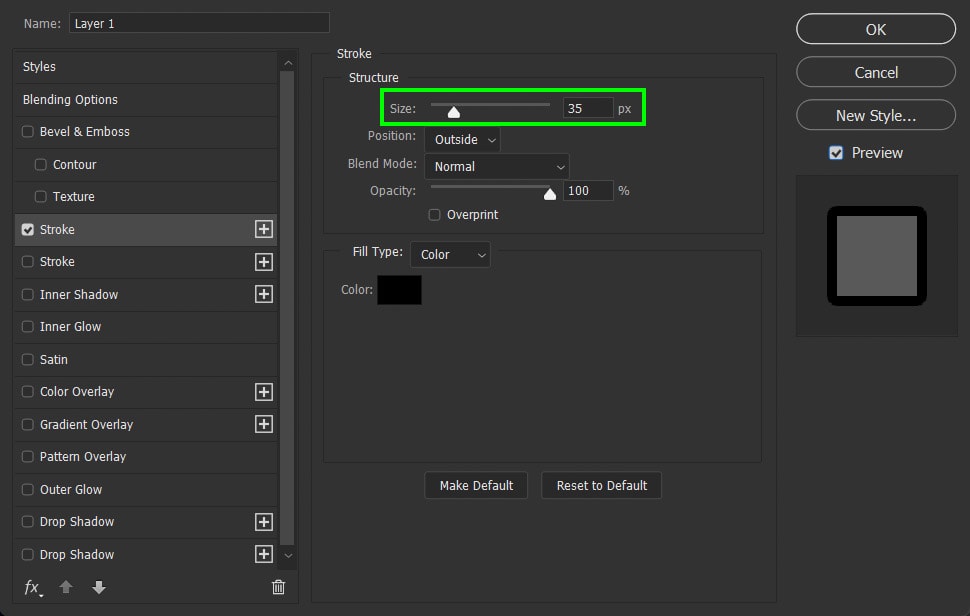 In the Layer Style window, select Stroke from the lefthand side panel and adjust the following settings to customize the stroke:
