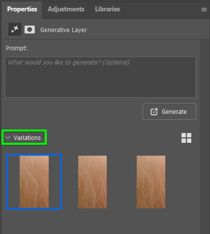 Without a prompt, Photoshop will remove the obvious issues within the selection. After a few moments, it will create new pixels. There will also be a few variations in the Properties Panel for you to choose from.