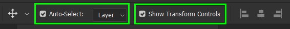 In the Options Bar, ensure the Auto-select box is checked and set to Layer in the dropdown menu. Also, check the Show Transform Controls box. Alternatively, to enable the Transform controls, you can also go to Edit > Free Transform with the text layer selected.