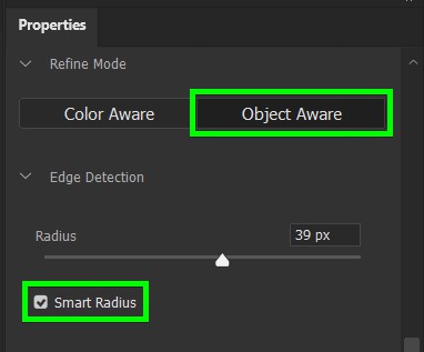 From the Select and Mask workspace, set the Refine Mode to Object Aware since it’s the best mode for selecting hair. Then, enable the Smart Radius checkbox.