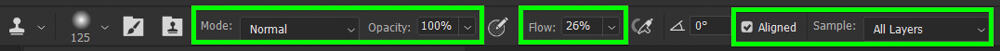 Before sampling the source area, you need to adjust the clone stamp settings in the Options bar: