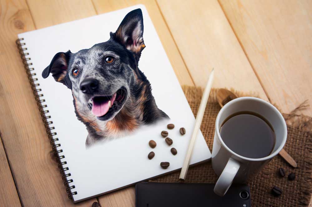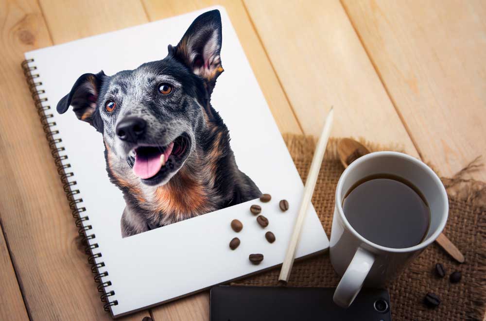 For this example, I will convert this image of a dog into a sketch and place it onto the sketch pad image. You can find several free stock images to use as the background on Pexels, and I am using this White Sketch Pad Beside a Cup of Coffee photo.