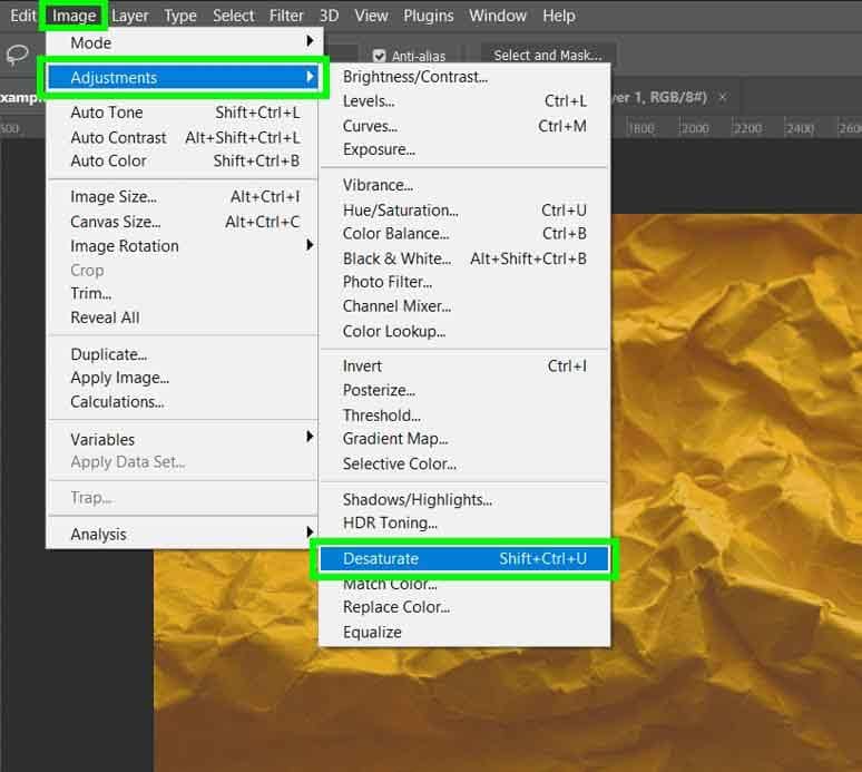 Now, desaturate the duplicated layer by clicking on Image > Adjustments > Desaturate to turn your background image from color to black & white.ย