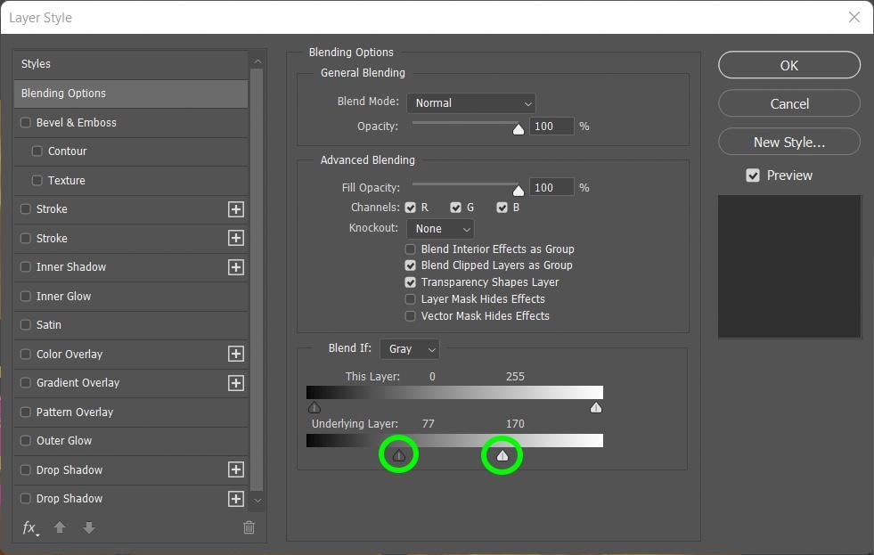 In the Layer Style panel, the slider youโre looking for is the Underlying Layer option.ย The black areas of the slider represent the shadows of the layer, and the white areas of the slider represent the highlights.ย If you move these sliders closer to the middle, you will notice your image distorting.ย ย