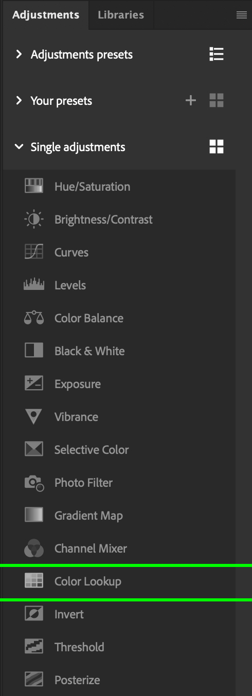 Once you’ve made the adjustments, add a new Color Lookup Adjustment Layer by heading to the Adjustments Panel (Window > Adjustments) and clicking the icon that looks like a table.