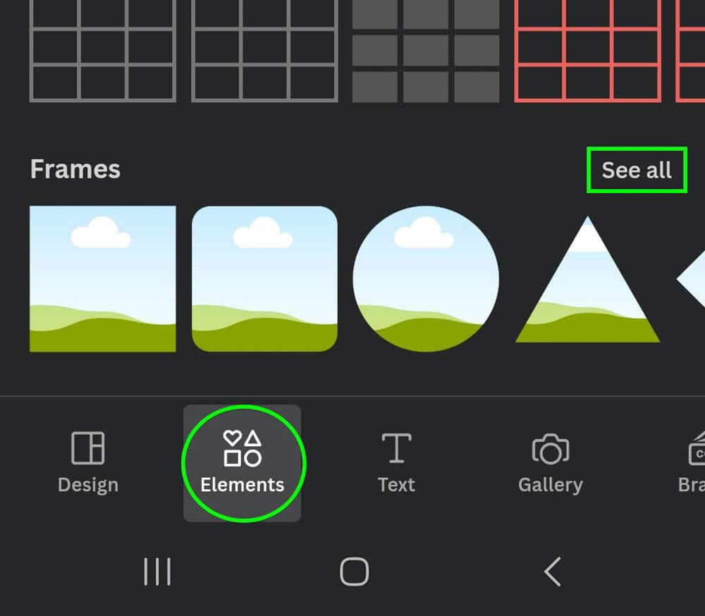 Then, open the Elements tab, scroll down until you find the Frames section, and click on See All to browse the available frames.