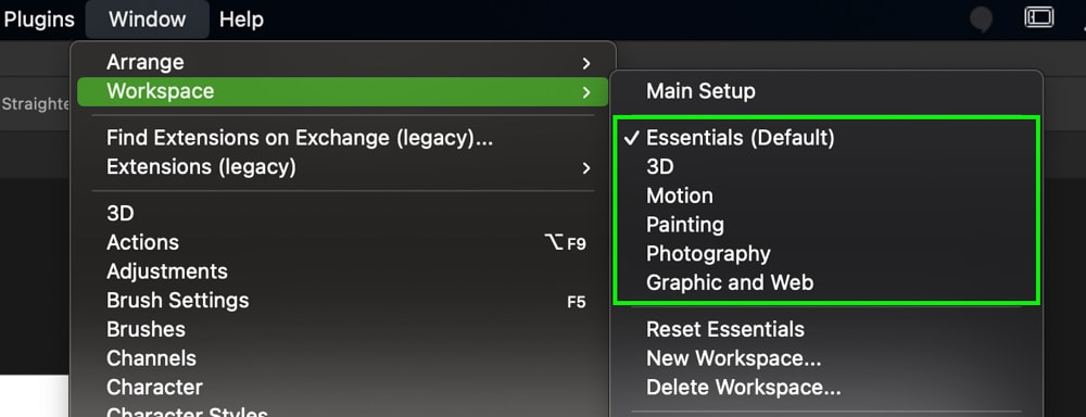 The overall layout of the panels and tools you see in Photoshop is called the workspace. By default, your workspace will be set to what’s known as the “Essentials Workspace,” which offers a general layout for any type of editing.