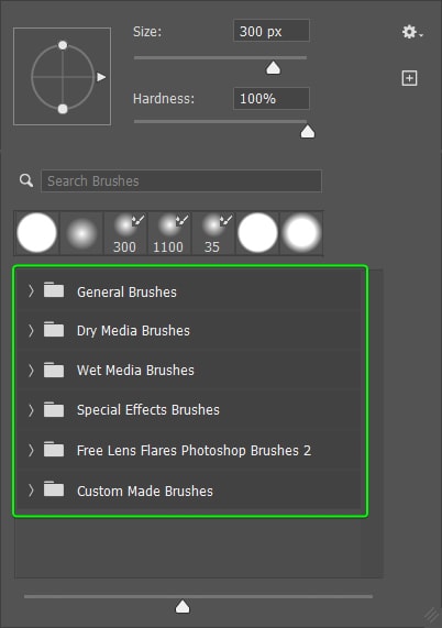 The default preset brushes and any brushes you create or import into Photoshop are separated into folders. You can navigate through the folders to choose the brush tip you need for your project.