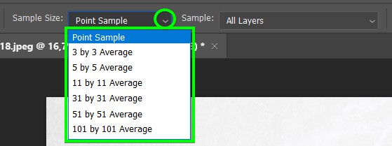 When sampling with the Eyedropper Tool, you don’t have to just sample one pixel at a time. You can actually sample much larger areas at once. To change the sample size, open the Sample Size Drop Down Menu in the Options Bar.