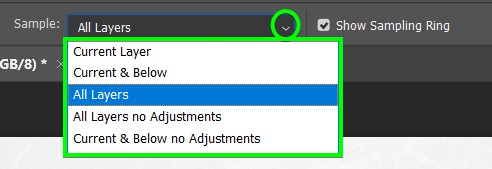 If you can’t see the Sampling Ring, make sure Show Sampling Ring is enabled in the Options Bar.