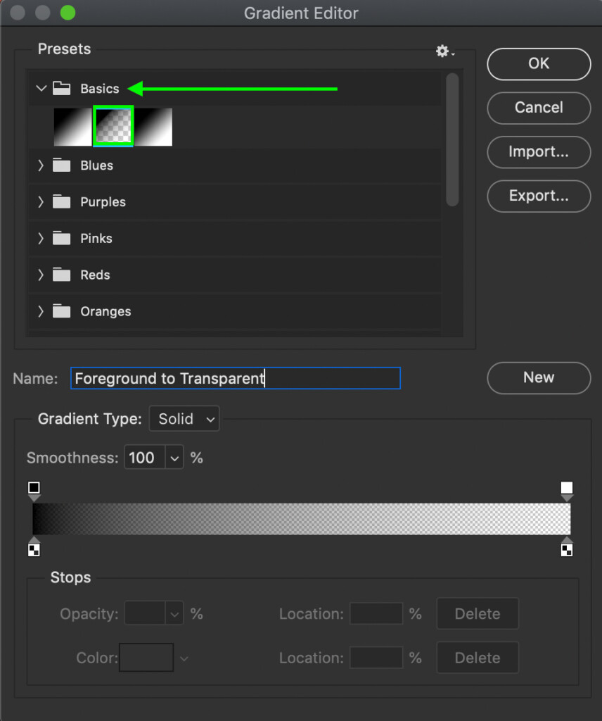 Select a Preset Gradient from the folders. Preset gradients can be used as-is or as a template for your own custom gradients. To select a preset option, open any color folder and click on your desired preset. You can set a colored gradient or a transparent gradient preset. Click OK once you have selected a gradient preset.