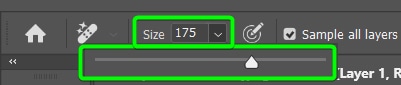 Use the Size slider in the Options Bar to set the size based on the objects in your image. Like any other brush, you can use [ to reduce the brush size or ] to increase the brush size.