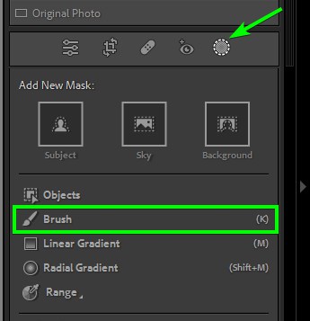 Head to the Develop Panel and click the Masking icon, which sits in the bar right above the Basic tab. From here, youโll see the different Masking tools available in Lightroom. Click the Brush option.