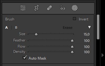 Then, set the settings of the eraser brush โ the size should be enough to erase the area you need to but not so large that you erase too much. Feathering should be quite high to keep a blended appearance, with Density and Flow set to 100. Next, paint over the areas you want to remove from the adjustment.