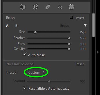 To add the preset to the adjustment brush, click on Custom next to Presets.