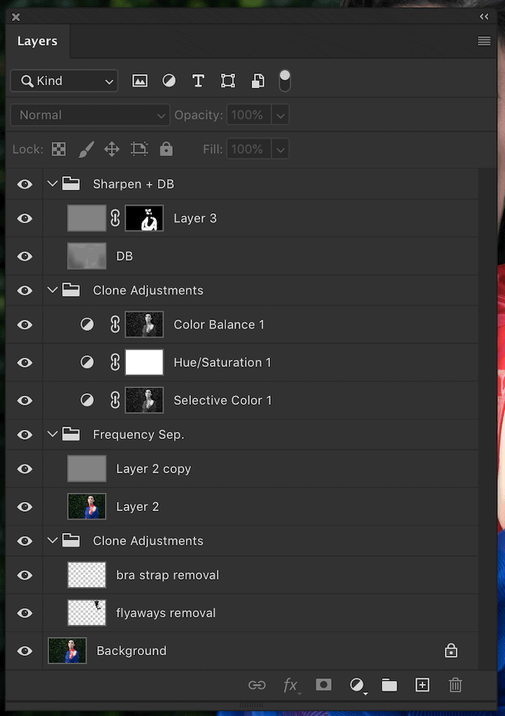 When editing a portrait, for example, you may want one group for skin adjustments and another for sharpening adjustments. This way all your related layers are in one place and they are much easier to locate.
