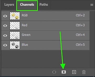 The other method to add your channel is to navigate to your Channels panel on the right-hand side of your workspace. This option is right next to the layer panel. At the bottom, click on โSave selection as channelโ.